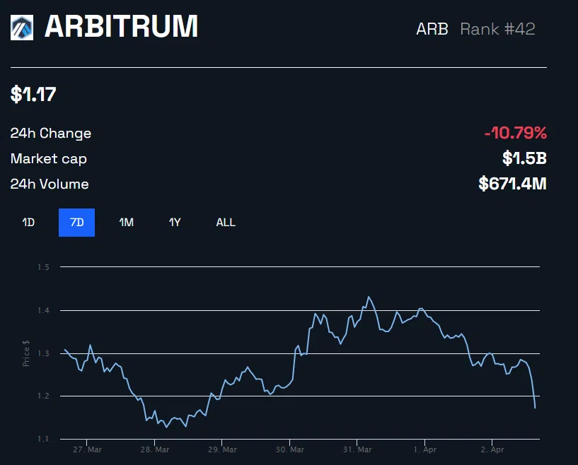 Mientras tanto, la acción de la Fundación ha afectado negativamente el rendimiento de los precios de ARB. El token ha disminuido 10,79% en las últimas 24 horas a 1,17 dólares al cierre de esta edición, según datos de BeInCrypto.