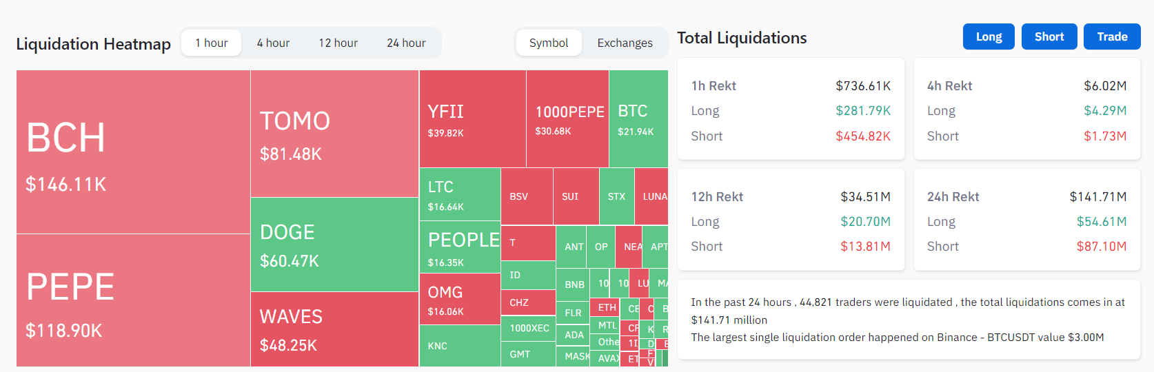 Según datos de Coinglass, de los 141,71 millones de dólares liquidados en las últimas 24 horas, las posiciones cortas representan 87,1 millones de dólares. La liquidación más grande ocurrió en Binance y fue valorada en 3 millones de dólares.