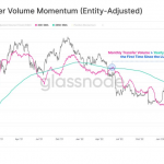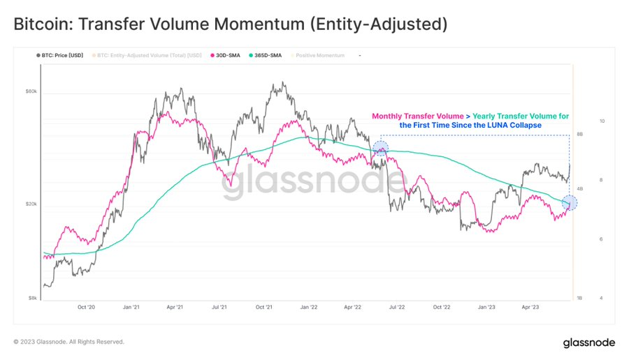 Mientras tanto, el renovado optimismo que rodea al mercado se ha traducido en un volumen de transferencia mensual de Bitcoin que supera la línea de base promedio anual por primera vez desde la implosión de LUNA, según datos de Glassnode.