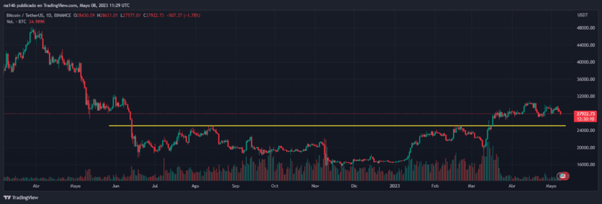 De continuar la caída en el precio de Bitcoin, los próximos soportes que se ven estarían en la zona de los 25.000 dólares, tal como se puede ver en el siguiente gráfico tomado de TradingView.