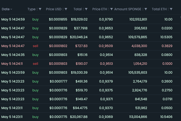 Un ejemplo que debemos tener en cuenta es que muchas de las órdenes de compra de SPONGE son superiores a los 10 Ethereum (ETH) y son realmente pocas las que están dispuestas a vender en ese momento.