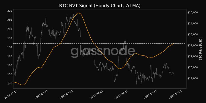 Además, Bitcoin Network Value to Transactions (NVT) Signal (7d MA) había alcanzado un máximo de un mes de 184.148. Los valores altos generalmente indican que el crecimiento de la capitalización de mercado supera el volumen de transferencia on-chain.