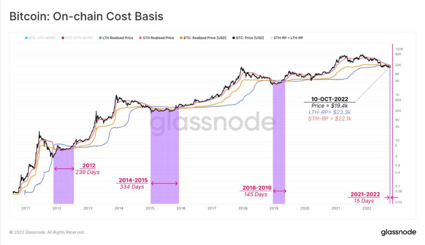 Los datos de Glassnode destacaron que la base de costos on-chain para los holders de Bitcoin a corto plazo había cruzado por debajo de la de los holders a largo plazo. Esto significó que los compradores de Bitcoin en los últimos cinco meses tienen una base de costos superior a aquellos que hicieron HODL durante toda la volatilidad del ciclo 2020-22.