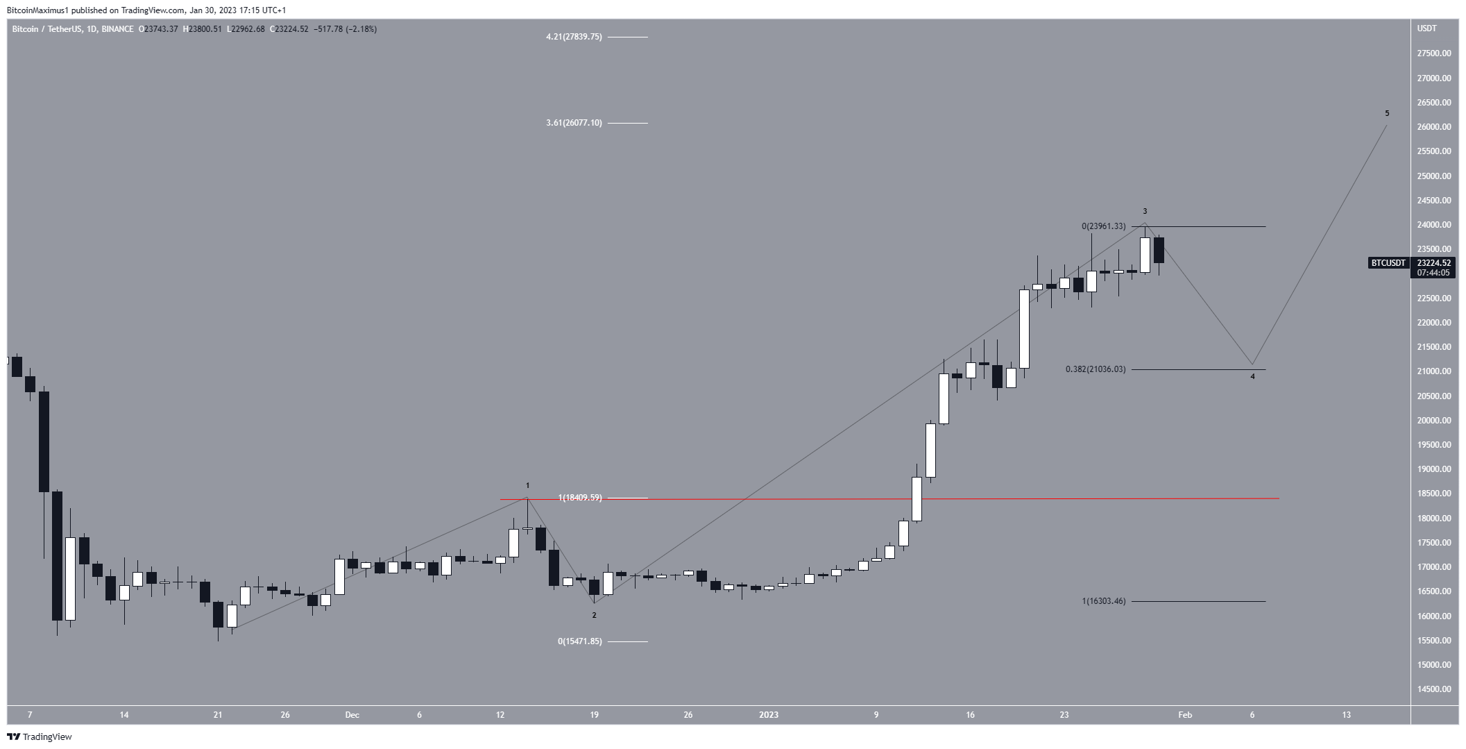 Para concluir, el pronóstico de precio de Bitcoin más probable es una caída a corto plazo hacia 21,040 dólares, seguida de un movimiento ascendente hacia 26,000 dólares y posiblemente 27,830 dólares.