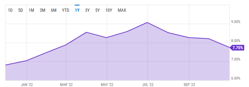 El IPC subió un 7.7 % en octubre de 2022 en comparación con el año anterior, que es el aumento interanual más bajo desde enero de 2022. Ha caído un 8.2% en comparación con septiembre de 2022.