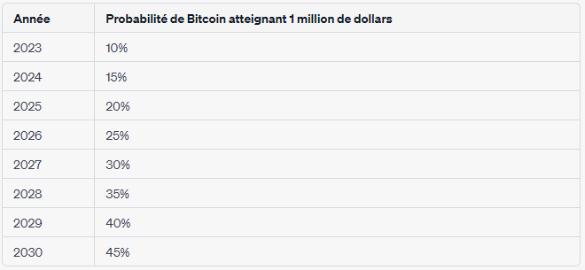 Entonces, si bien 2025-2030 es un marco de tiempo a tener en cuenta, hay menos de uno en dos posibilidades por año de que Bitcoin termine en 1 millón de dólares
