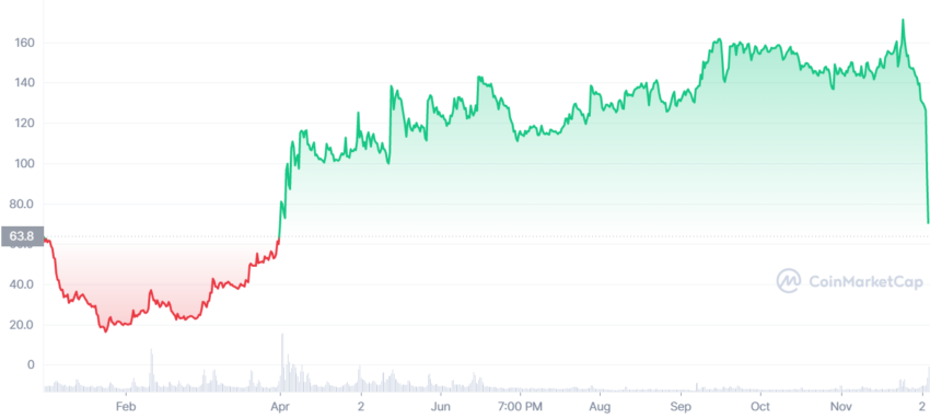 En las últimas 24 horas, BNX cayó más del 50%. El token cayó a 58,25 dólares desde 126 dólares.