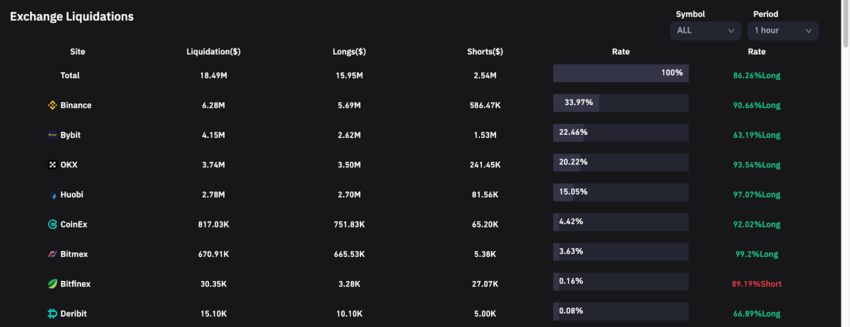Los traders de criptomonedas que habían apostado por el impulso del mercado alcista sufrieron liquidaciones. Entre todas las operaciones, se liquidó el 86,26% de los largos por valor de 15,95 millones de dólares.