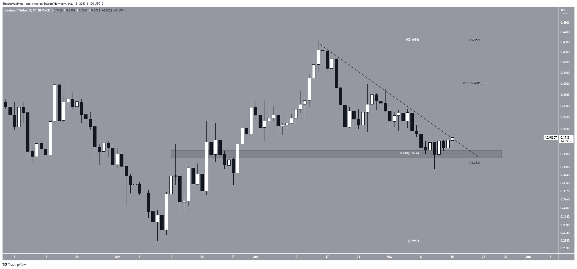 Actualmente, ADA cotiza justo por encima de una convergencia de niveles de soporte de alrededor de 0.36 dólares. Este soporte está formado por un área de soporte horizontal y el nivel de soporte de retroceso de Fibonacci de 0.618.