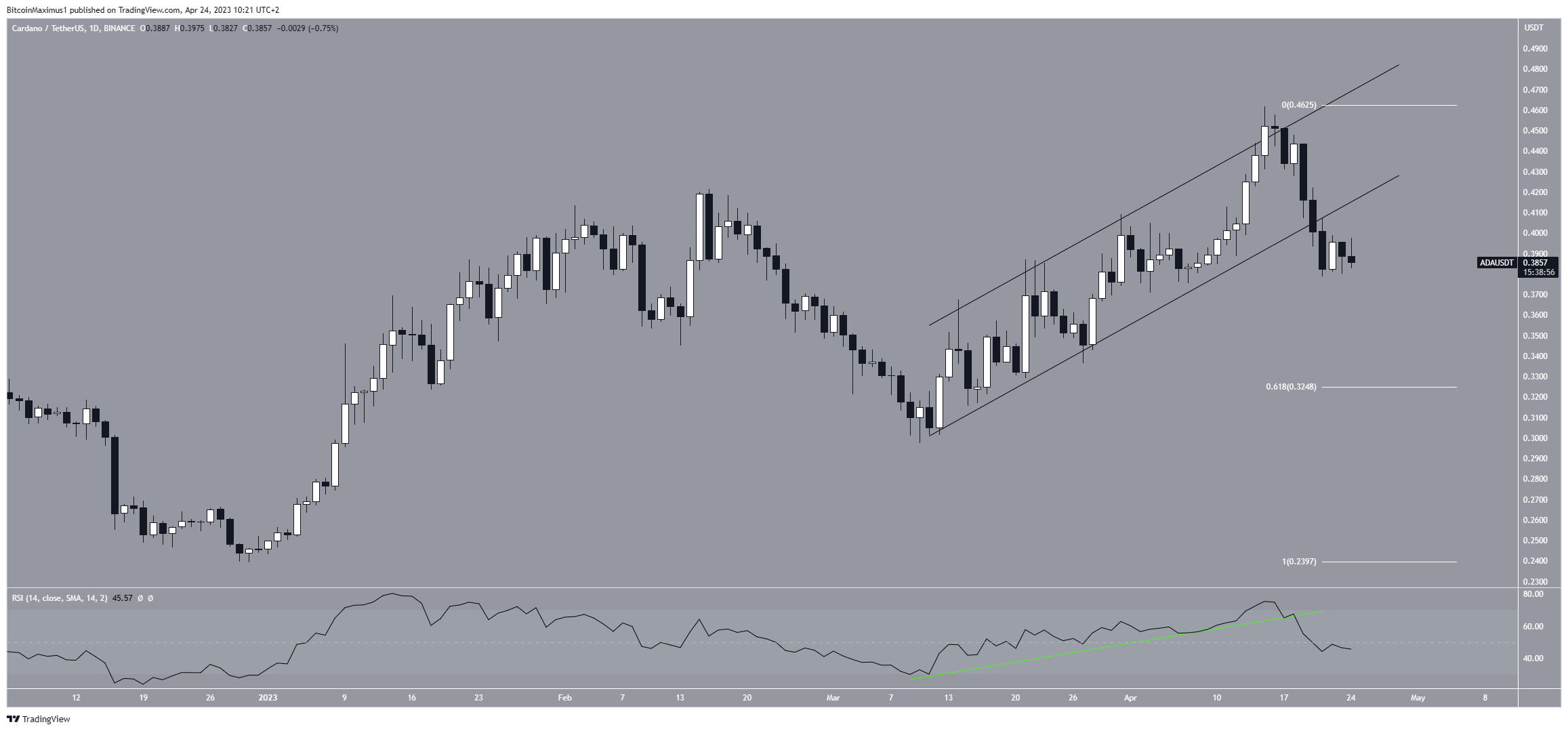 En primer lugar, el 20 de abril, el precio del token ADA se rompió desde un canal paralelo ascendente en el que había estado operando desde el 10 de marzo. Este tipo de canal se caracteriza por el movimiento del precio entre dos líneas paralelas de resistencia y soporte y generalmente se considera un patrón bajista.