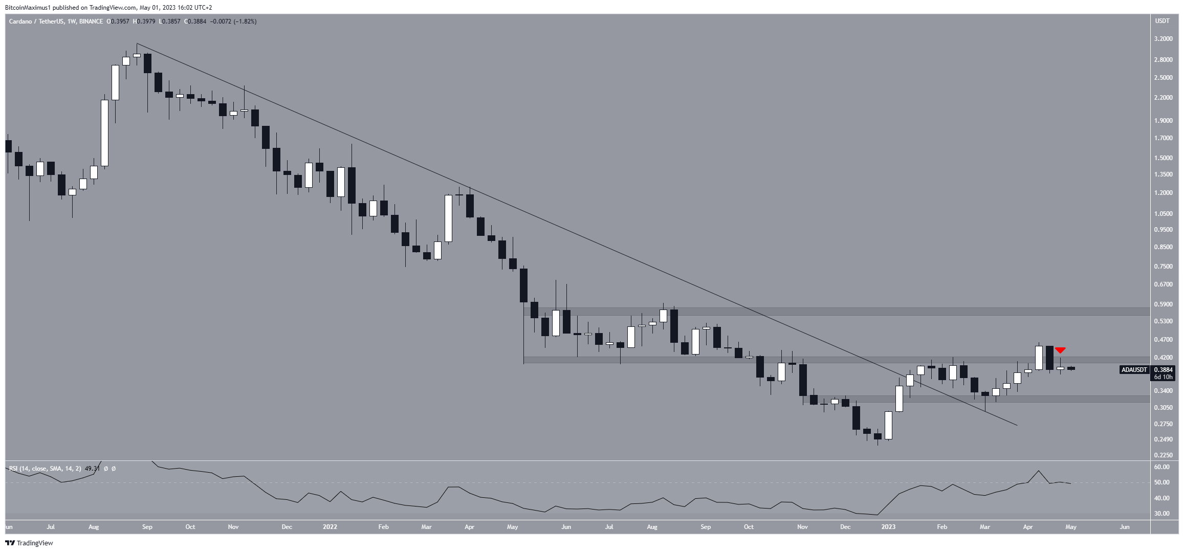ADA es el token nativo de la blockchain Cardano, creada por Charles Hoskinson. El precio del token ADA cayó drásticamente en las últimas dos semanas, como lo demuestran las lecturas semanales a largo plazo.