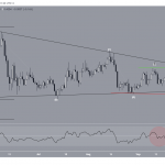 La línea de soporte se ha tocado cinco veces hasta ahora, lo que sugiere que una eventual ruptura es el escenario más probable. El hecho de que el triángulo transpira después de un movimiento hacia abajo respalda aún más esta posibilidad. Además, el RSI está por debajo de 50, otra señal de que la tendencia es bajista.