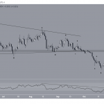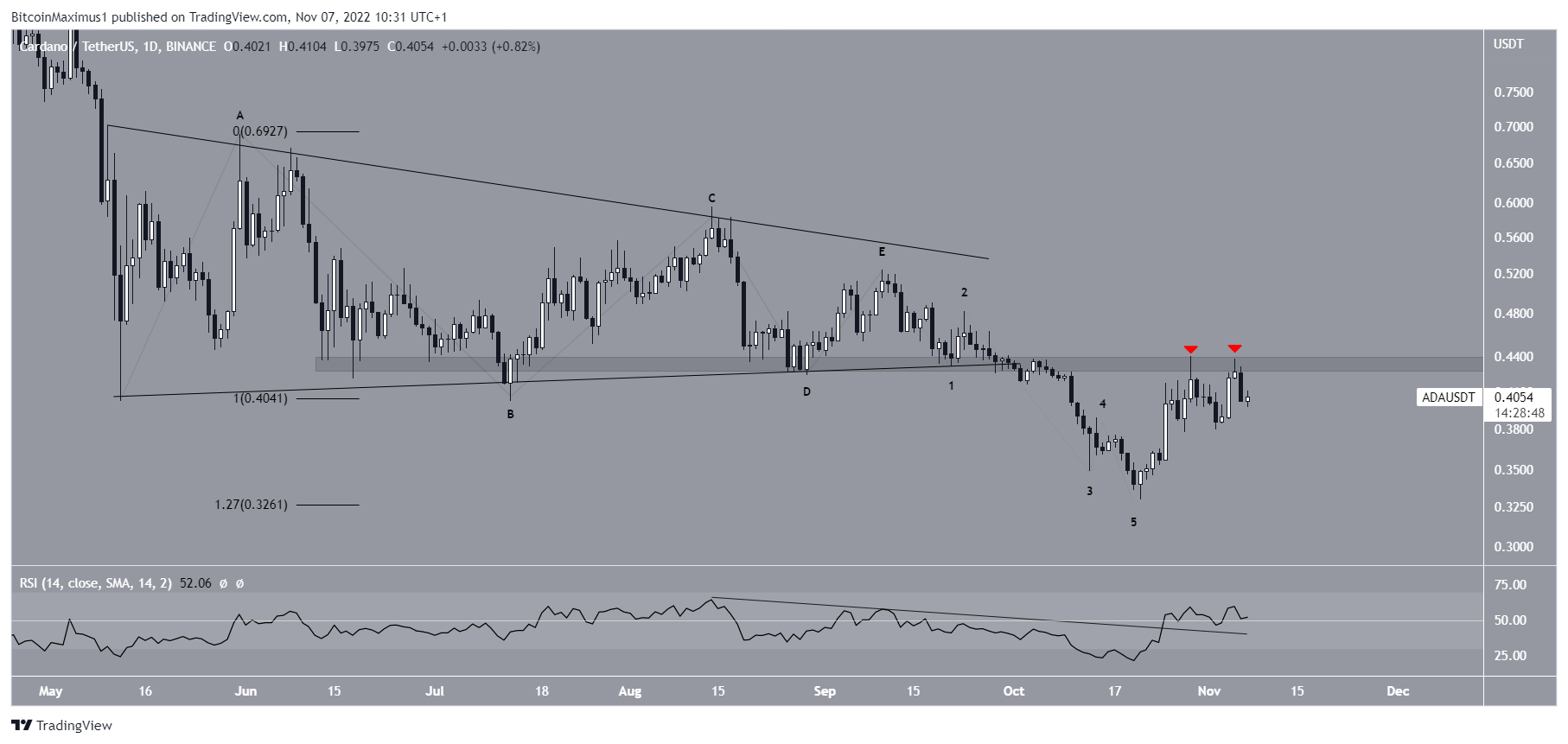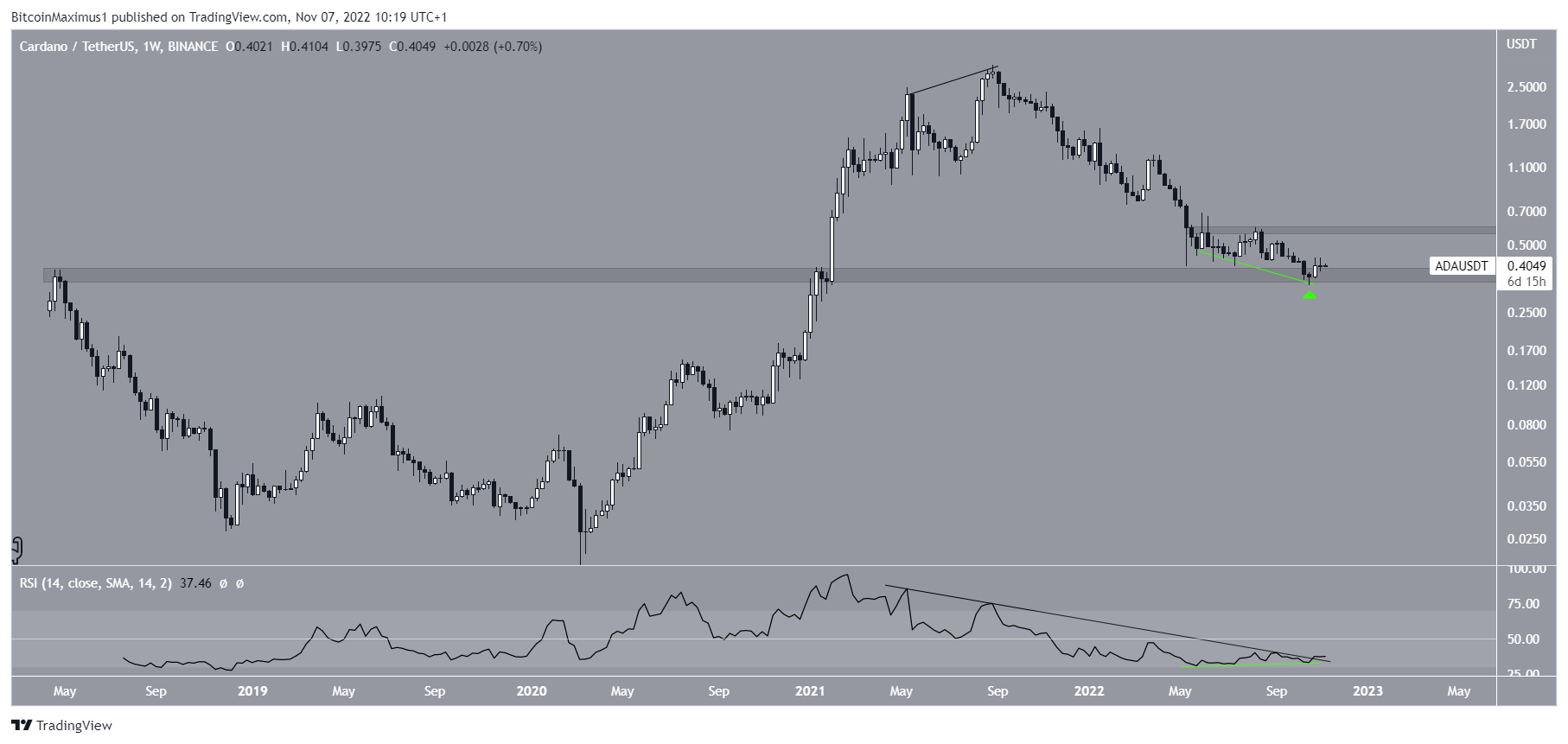 El precio de Cardano (ADA) había caído desde agosto de 2021, cuando alcanzó un precio máximo histórico de 3.10 dólares. La caída estuvo precedida por una divergencia bajista en el RSI semanal (línea negra). Condujo a un precio mínimo de 0.33 dólares en octubre de 2022.
