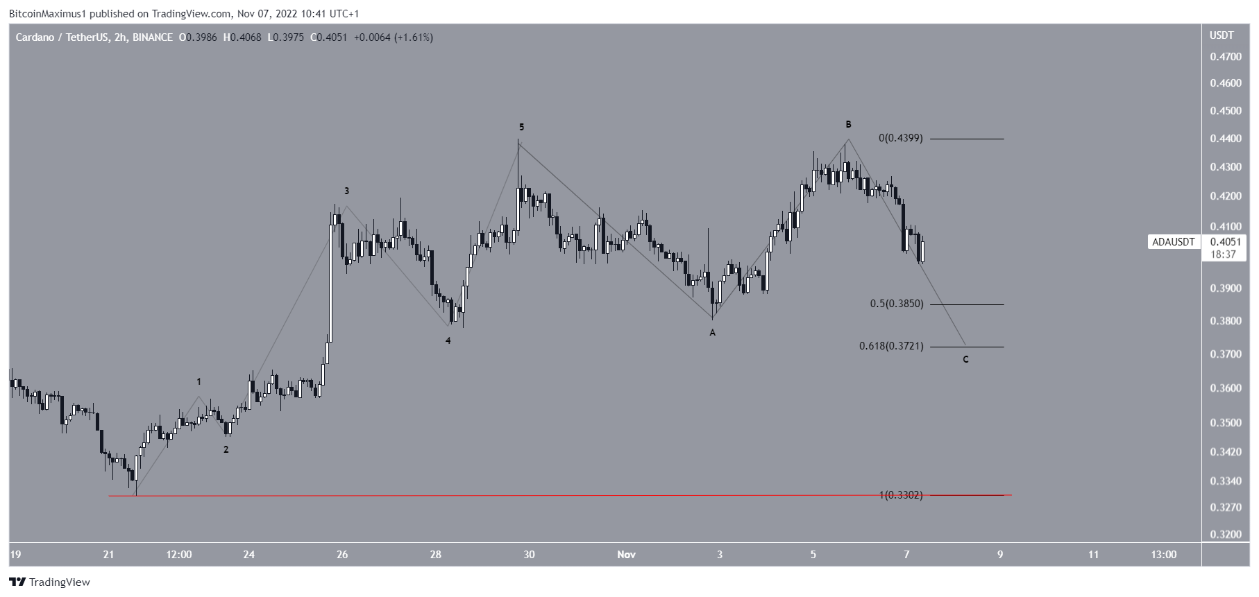 El análisis técnico del marco de tiempo diario respalda los hallazgos del semanal. Tras romper un triángulo simétrico el 4 de octubre, el precio de ADA alcanzó un mínimo de 0.33 dólares el 21 de octubre. La acción del precio desde el colapso muestra un movimiento descendente completo de cinco ondas.