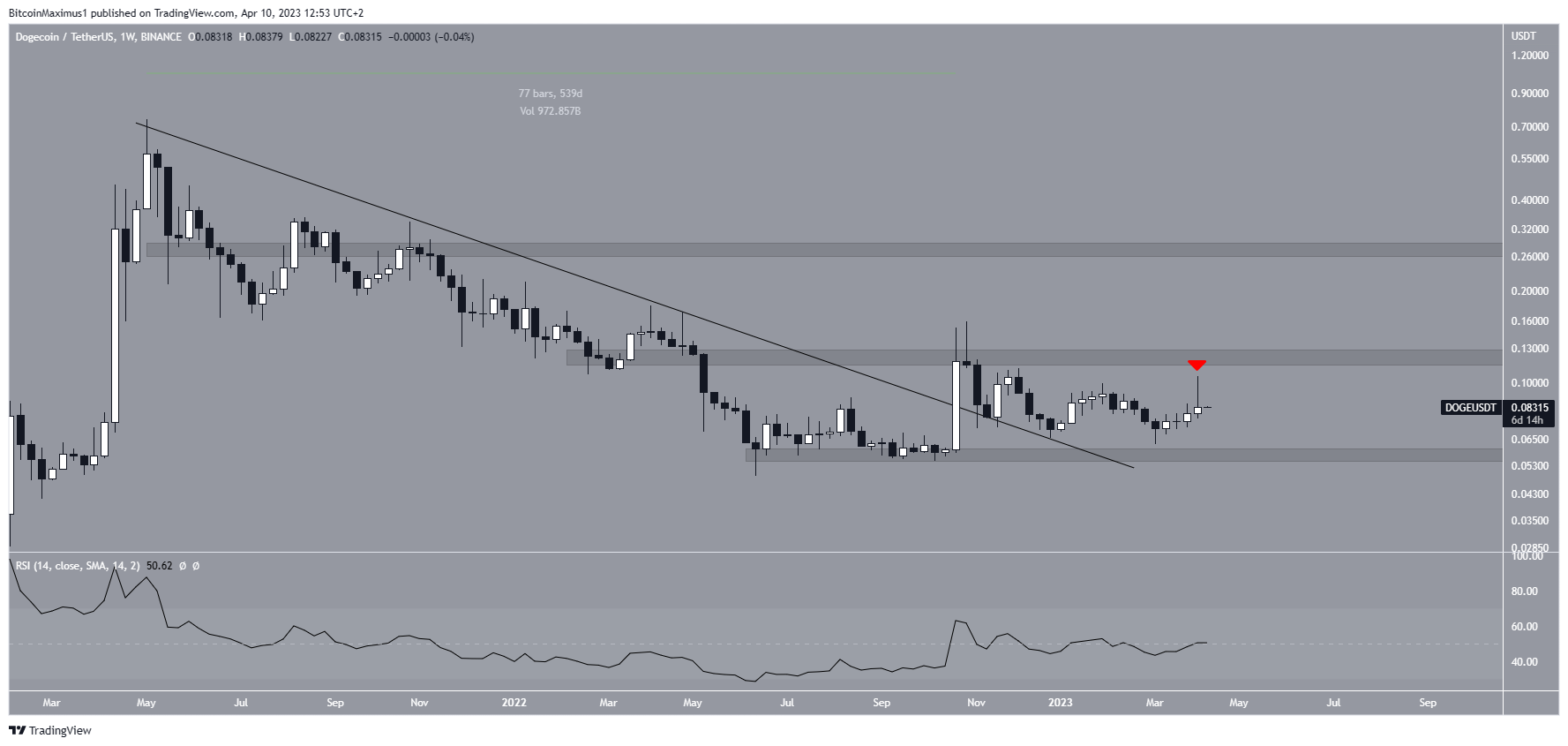 Aunque DOGE creó una mecha superior larga la semana pasada (icono rojo), el RSI semanal todavía está por encima de 50. Por lo tanto, se espera otro intento de alcanzar el área de resistencia de 0.128 dólares.