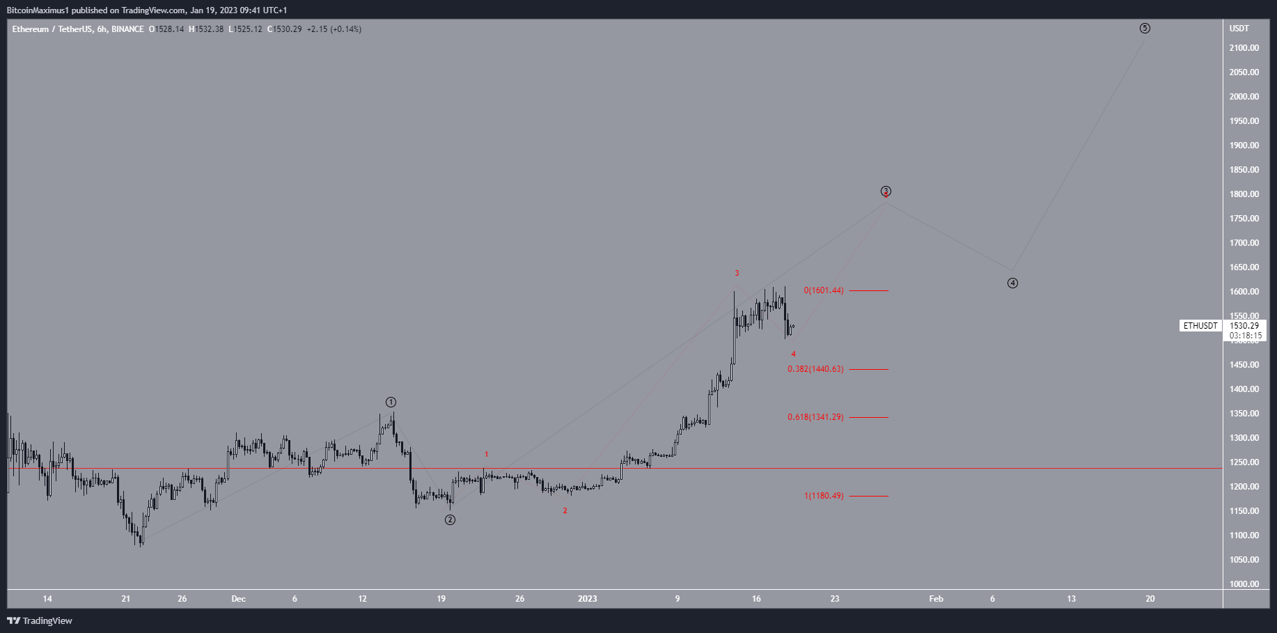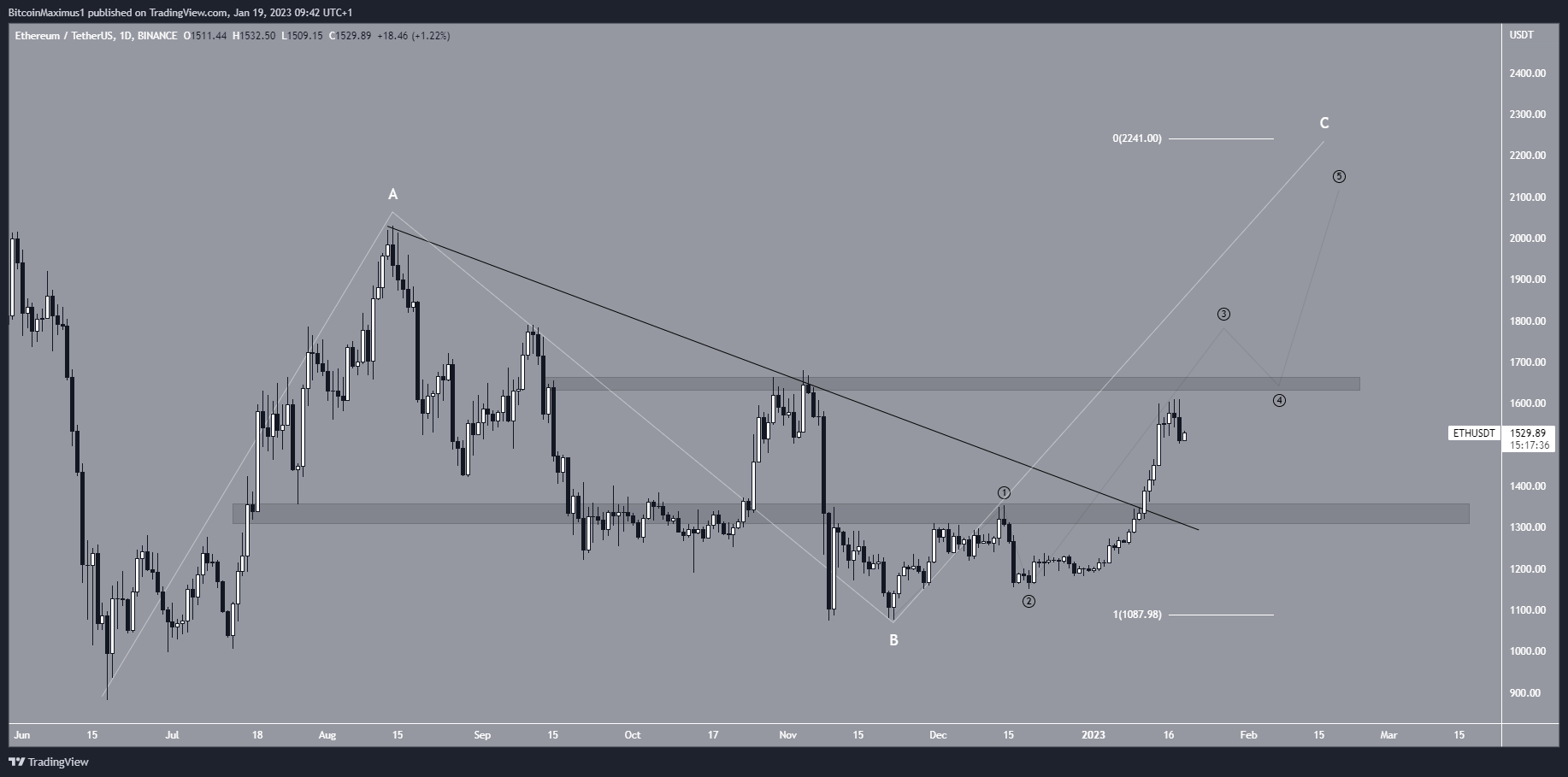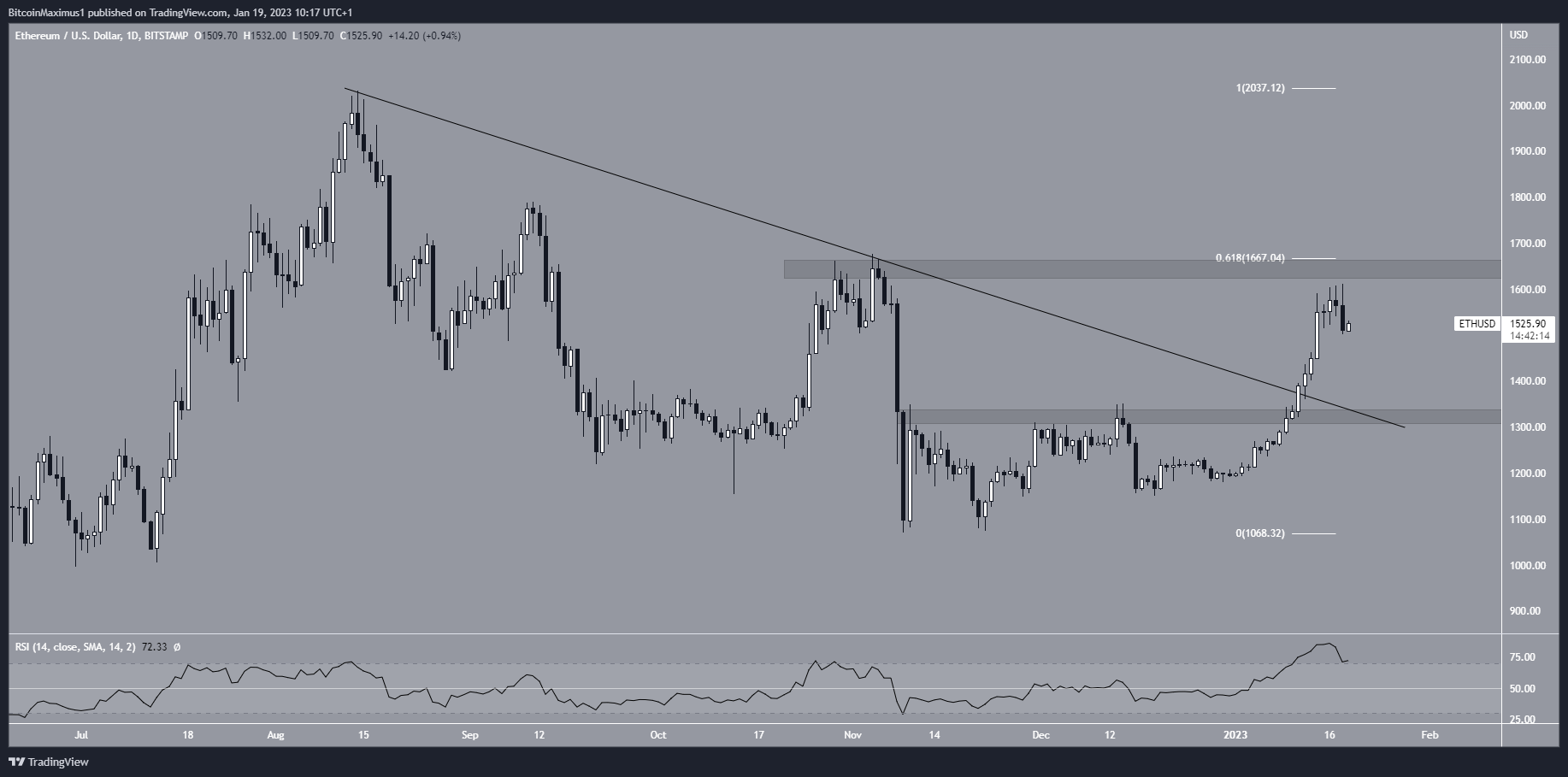 El precio de Ethereum ha aumentado a un ritmo acelerado desde principios de año. El 11 de enero, salió tanto del área de resistencia de 1,350 dólares como de una línea de resistencia descendente que estaba vigente desde agosto de 2022. Hasta ahora, el precio de ETH ha alcanzado un máximo de 1,611 dólares.