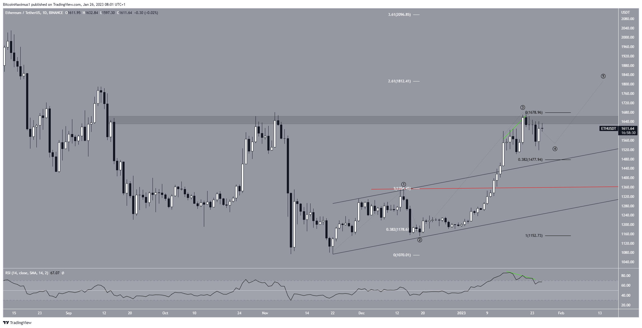 El precio de Ethereum (ETH) ha caído desde que el área de resistencia de 1,660 dólares lo rechazó el 21 de enero. El precio podría estar corrigiéndose en previsión de otro movimiento alcista.