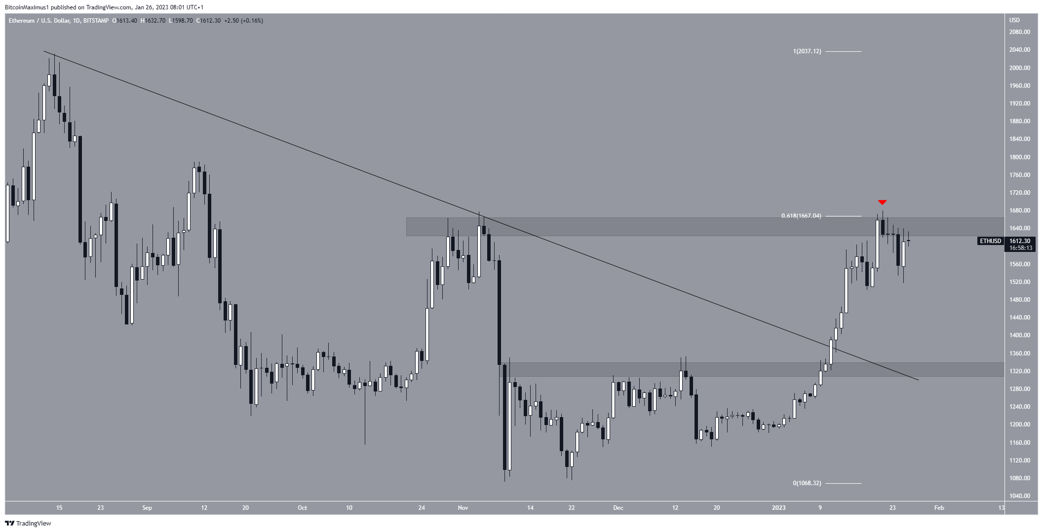 A pesar del rechazo anterior, el precio de ETH creó una vela alcista el 26 de enero y podría estar en proceso de hacer otro intento de ruptura.