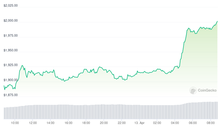 El aumento del precio de Ethereum ha sido impulsado principalmente por el hard fork Shapella. Al momento de la publicación, el precio de ETH se ubica en 2,001.66 dólares, tras experimentar un crecimiento del 6% en las últimas 24 horas.