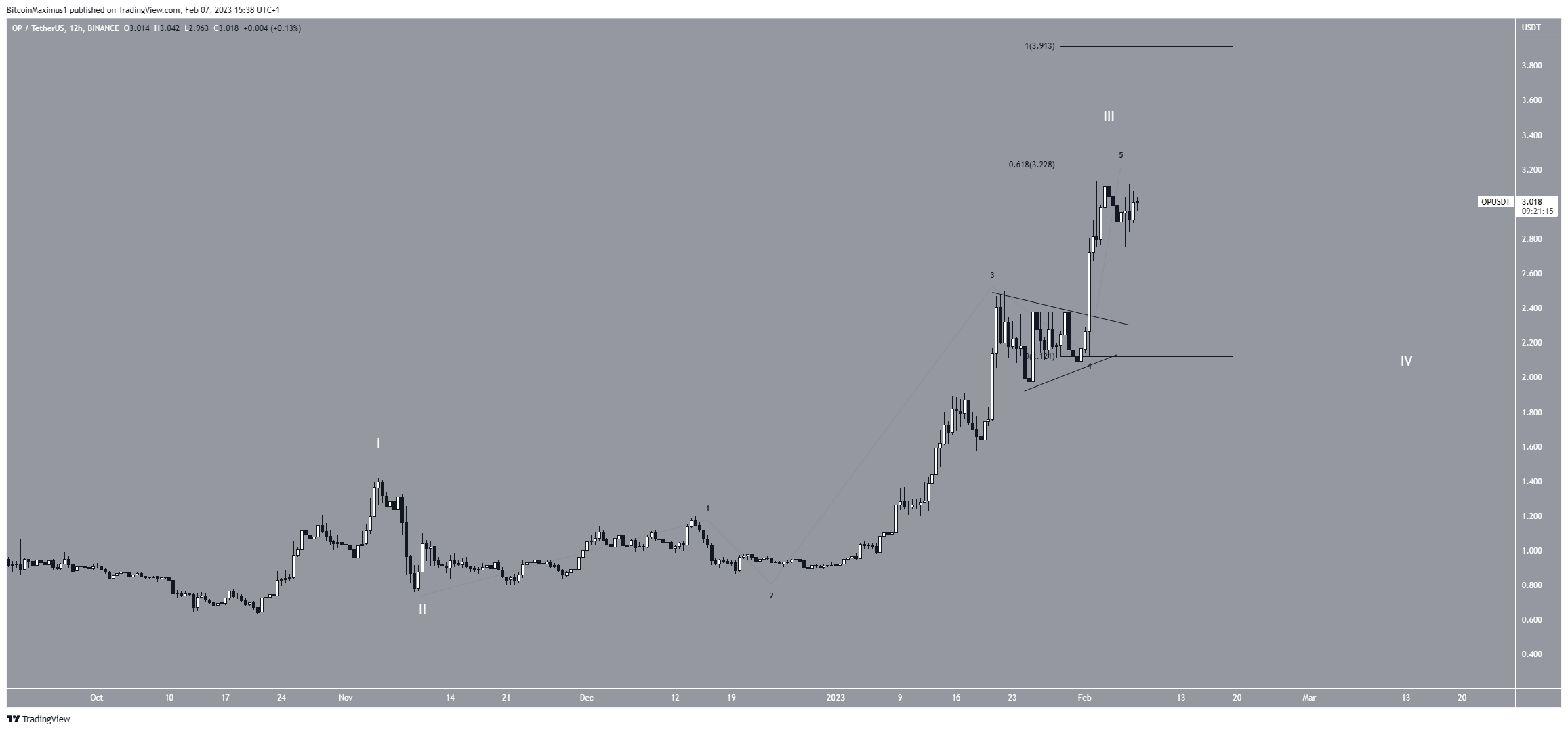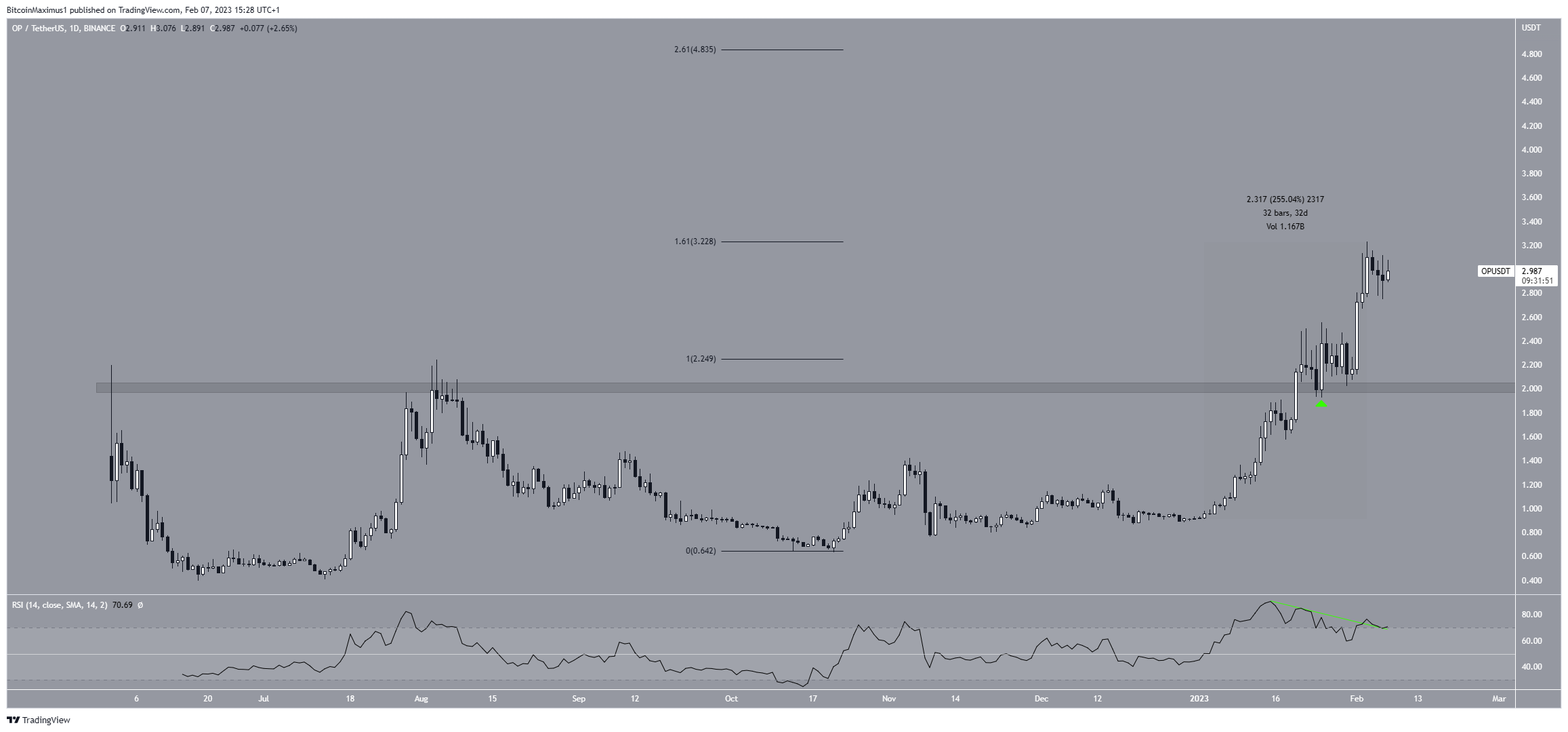El precio de OP se ha disparado en 2023, aumentando un 255%. Esto condujo a un nuevo precio máximo histórico de 3.13 dólares el 3 de febrero. El máximo se alcanzó exactamente en el retroceso de 1,61 Fibonacci de la caída anterior.