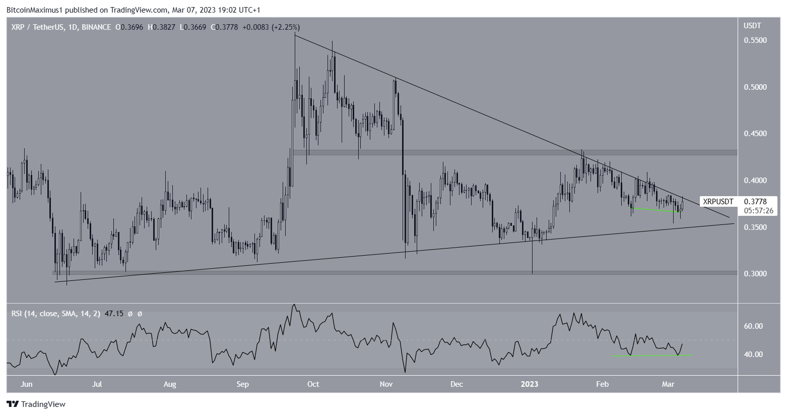 El precio de XRP se ha negociado dentro de un triángulo simétrico desde junio de 2022. Las líneas de soporte y resistencia del triángulo se han validado en numerosas ocasiones.