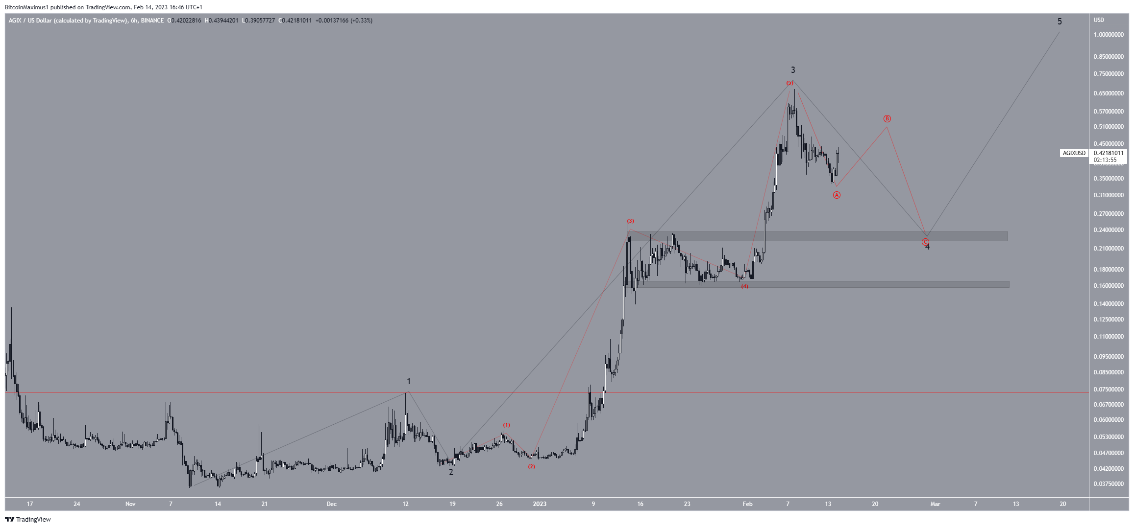 El recuento de ondas muestra que el precio de AGIX probablemente se encuentre en la onda cuatro de un movimiento ascendente de cinco ondas (negro). La onda tres se extendió considerablemente. El recuento de sub-ondas se da en rojo.