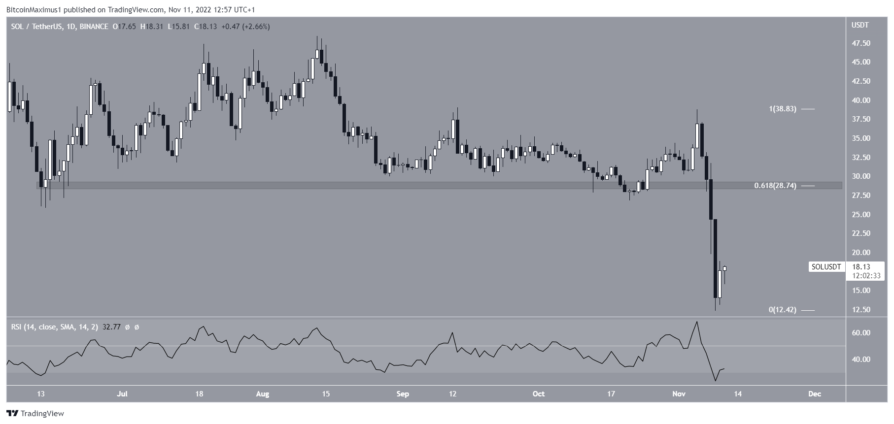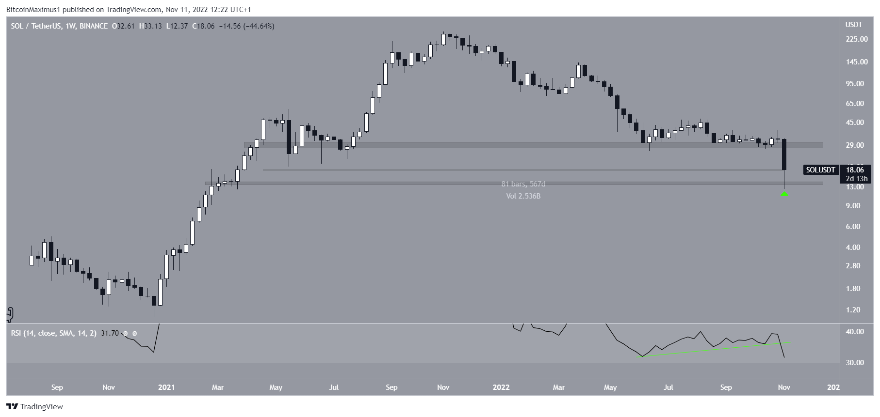 El precio de Solana ha caído desde que alcanzó un precio máximo histórico de 253.30 dólares en noviembre de 2021. Inicialmente, el precio de Solana rebotó en el área de soporte horizontal de 29 dólares. Sin embargo, experimentó una ruptura el 9 de noviembre y procedió a alcanzar un mínimo de 12.37 dólares en noviembre de 2022.