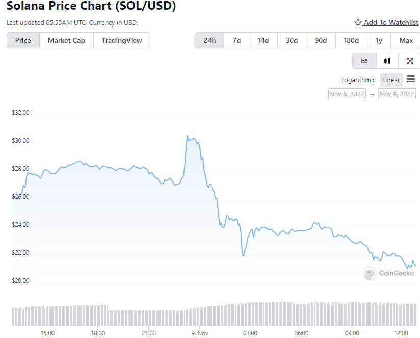 El token SOL, nativo de Solana, ha caído alrededor del 24% en las últimas 24 horas. Esto es dos veces más que el resto del mercado, pero no tan malo como FTT, que se ha desplomado un 75%.