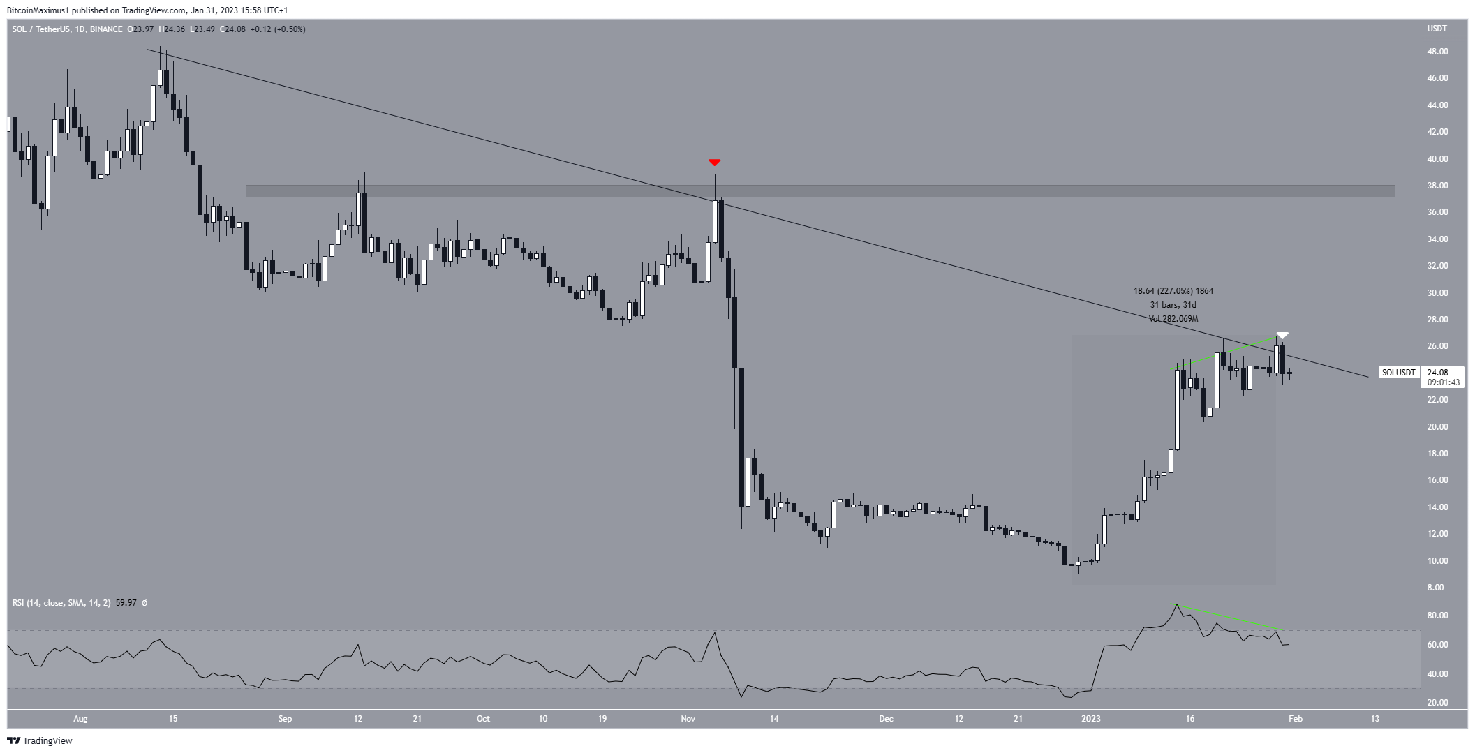 Desde el 13 de agosto, el precio de Solana ha caído por debajo de una línea de resistencia decreciente. La línea condujo a un rechazo a principios de noviembre, lo que resultó en un precio mínimo de 8 dólares el 29 de diciembre. Después de eso, el precio inició una tendencia alcista significativa que desde entonces ha visto una ganancia del 227%.