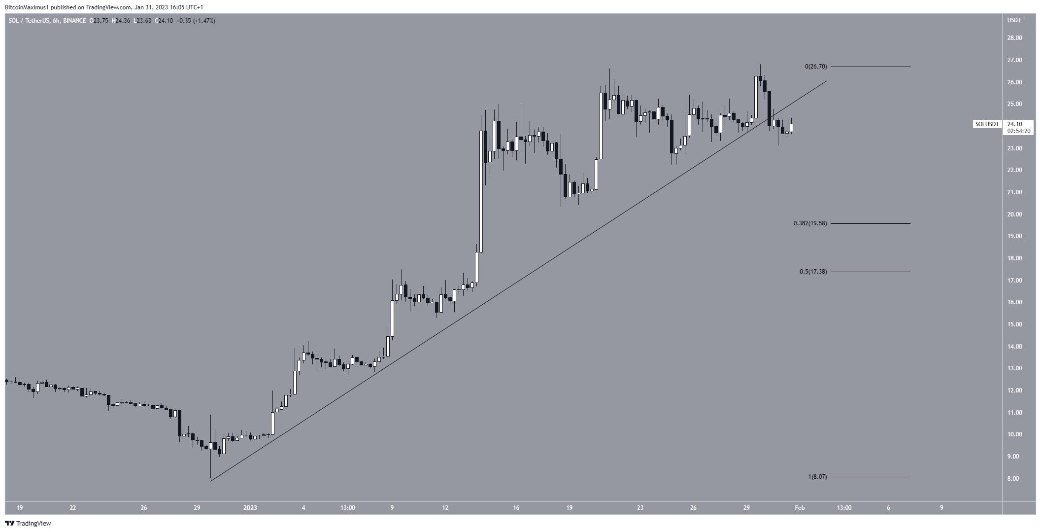 Una mirada al análisis técnico para el marco de tiempo de seis horas muestra que el precio de SOL acaba de romperse desde una línea de soporte ascendente establecida desde principios de año. Las rupturas de tales estructuras a largo plazo a menudo conducen a movimientos a la baja.