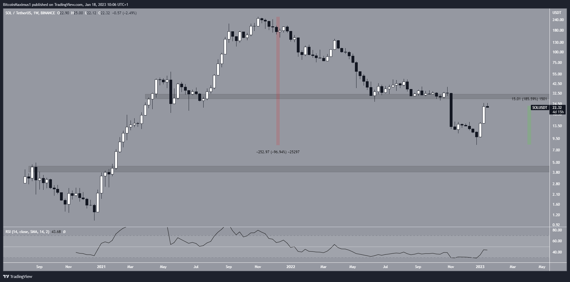El precio de Solana ha caído desde que alcanzó un máximo histórico de 259.90 dólares en noviembre de 2021. El movimiento a la baja llevó a un mínimo de 8 dólares en diciembre de 2022. Esta fue una caída del 97% desde el máximo histórico. La caída también provocó una ruptura del área de soporte horizontal de 30 dólares, que ahora se espera que brinde resistencia.
