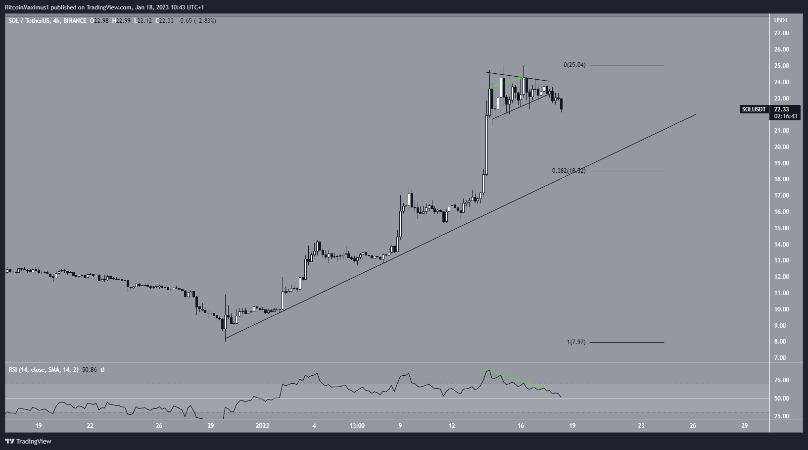 Una mirada más cercana al análisis técnico del marco de tiempo de cuatro horas muestra que el precio de Solana ha aumentado junto con una línea de soporte ascendente. Actualmente, la línea coincide con el nivel de soporte de retroceso de Fibonacci de 0.382 de todo el movimiento alcista.