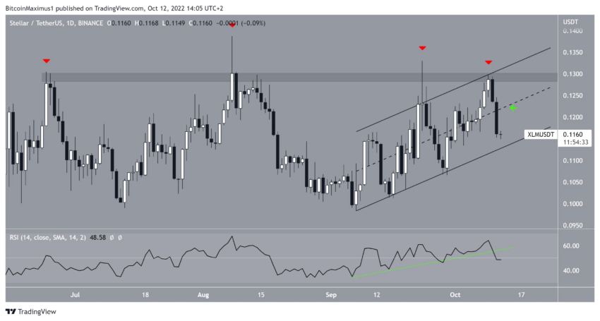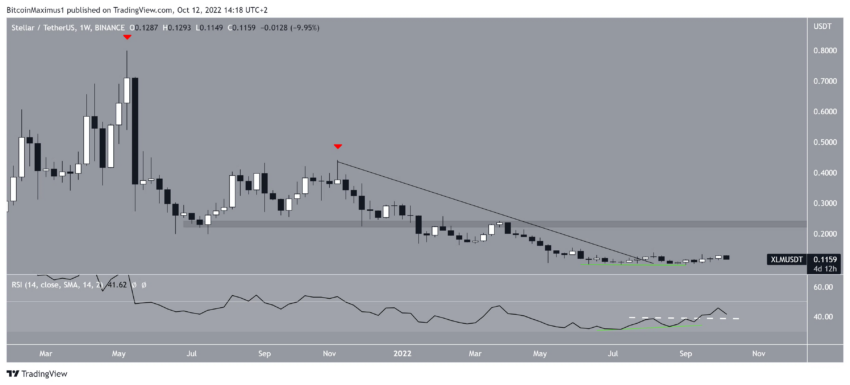 XLM ha estado cayendo desde que alcanzó un máximo de 0.798 dólares en mayo de 2021. El precio creó un máximo más bajo (icono rojo) en noviembre del mismo año y después comenzó a caer por debajo de una línea de resistencia descendente. Este movimiento lo llevó a un mínimo de 0.099 dólares en julio de 2022.
