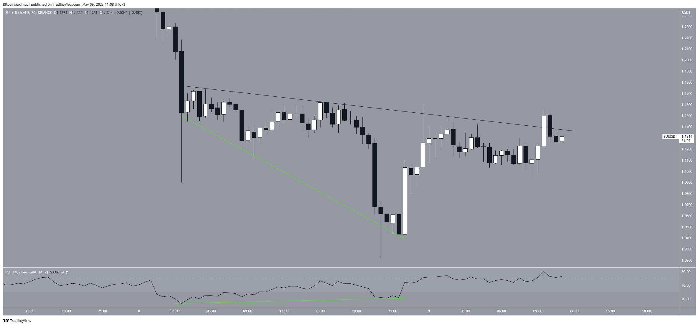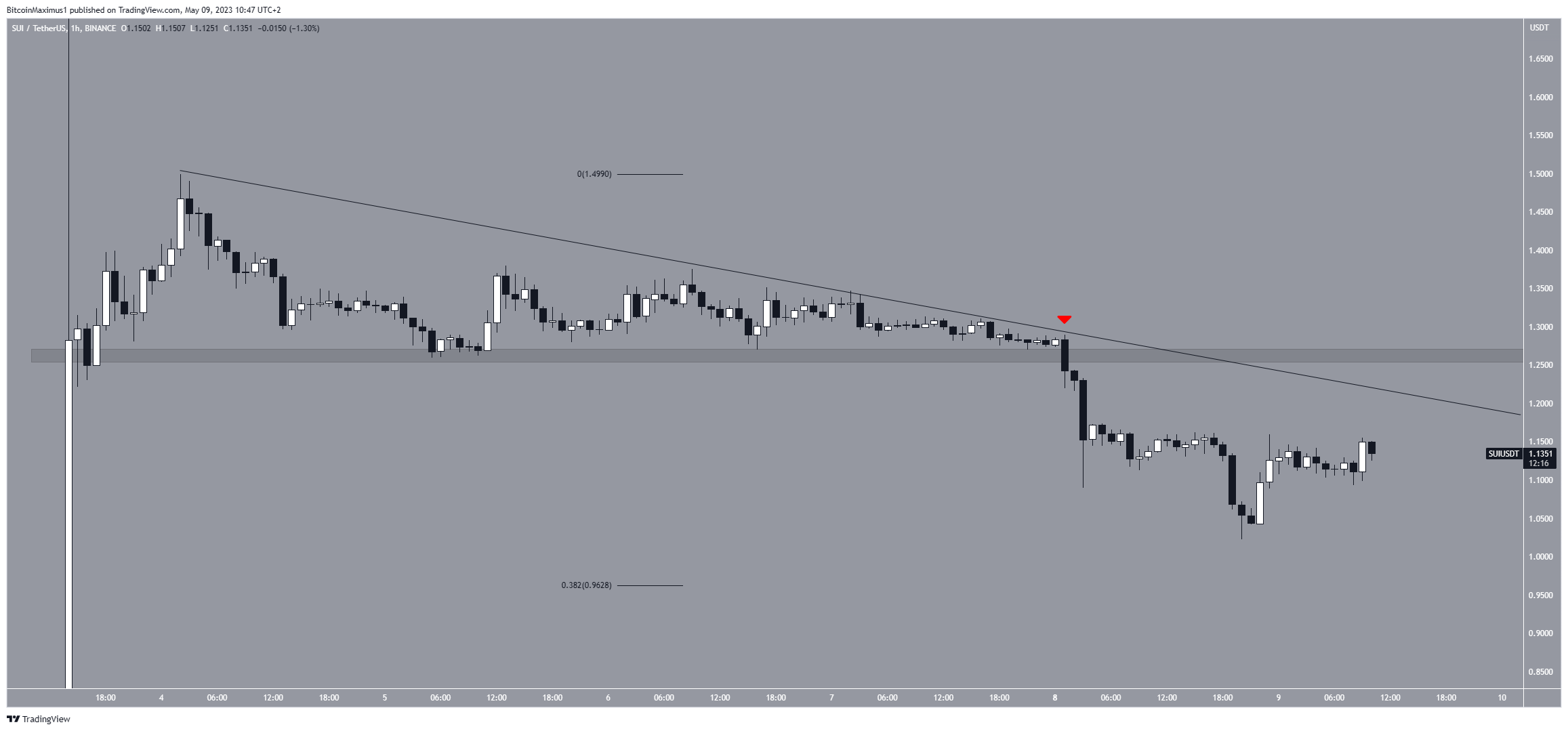 El precio de SUI ha caído por debajo de una línea de resistencia descendente desde el 4 de mayo. Más recientemente, la línea provocó un rechazo el 8 de marzo (icono rojo). En ese momento, la línea estaba muy cerca del área de soporte horizontal de 1.25 dólares.