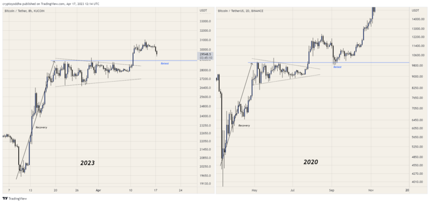 Guiado por la teoría del ciclo de Bitcoin, @CryptoYoddha comparó el comportamiento actual de la moneda con sus movimientos en el ciclo después del halving de 2016 y llegó a la conclusión de que el aumento está dentro de las posibilidades.