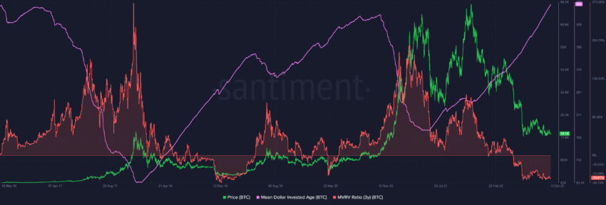 Los datos de Santiment presentaron que el indicador Mean Dollar Invested Age (MDIA) está en su punto más alto, lo que significa que no hay distribución de monedas durante mucho tiempo. Por otro lado, la tendencia MVRV (3 años) del último año y medio se parece mucho a la situación 2017-2019.