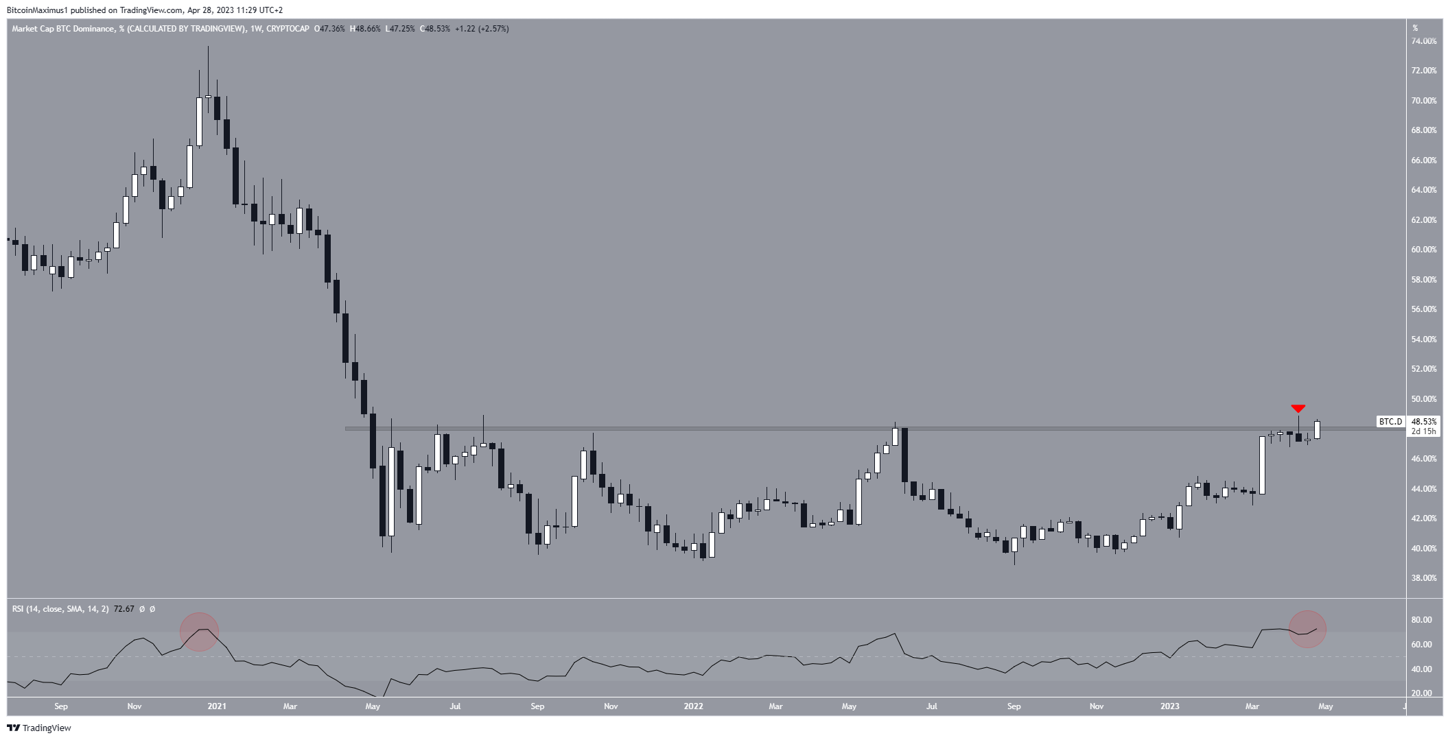 Aunque la BTCD está cerca de un nuevo máximo anual, muestra varios signos bajistas. En primer lugar, creó una vela de estrella fugaz en el marco de tiempo semanal (icono rojo).