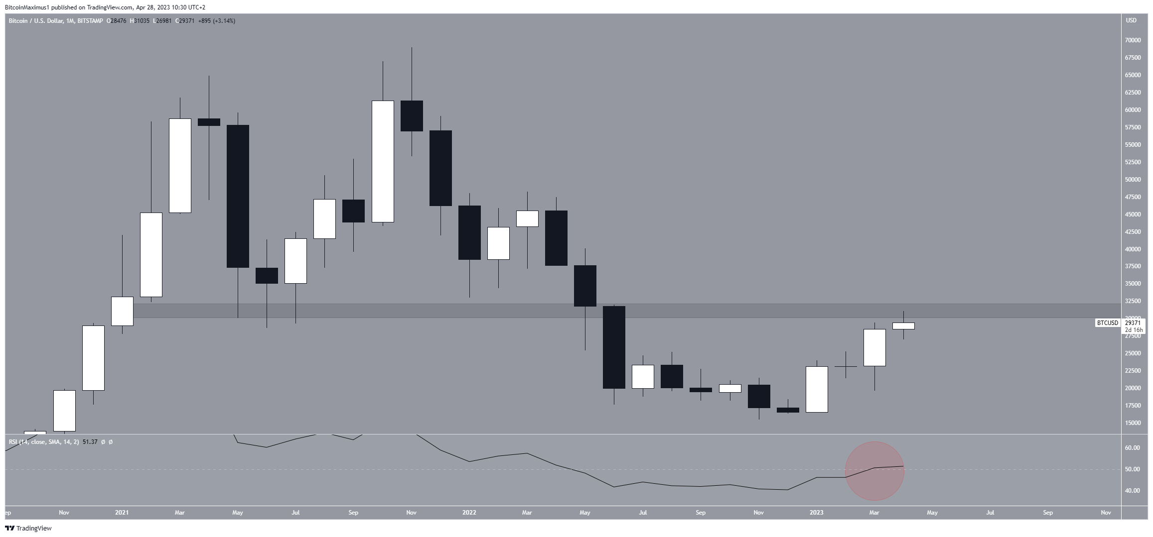 El precio de Bitcoin ha creado tres cierres de velas mensuales alcistas sucesivos. A menos que el precio cierre por debajo de 28,476 dólares en los últimos dos días de abril, la vela mensual también será alcista, lo que llevará a la cuarta vela consecutiva de este tipo.