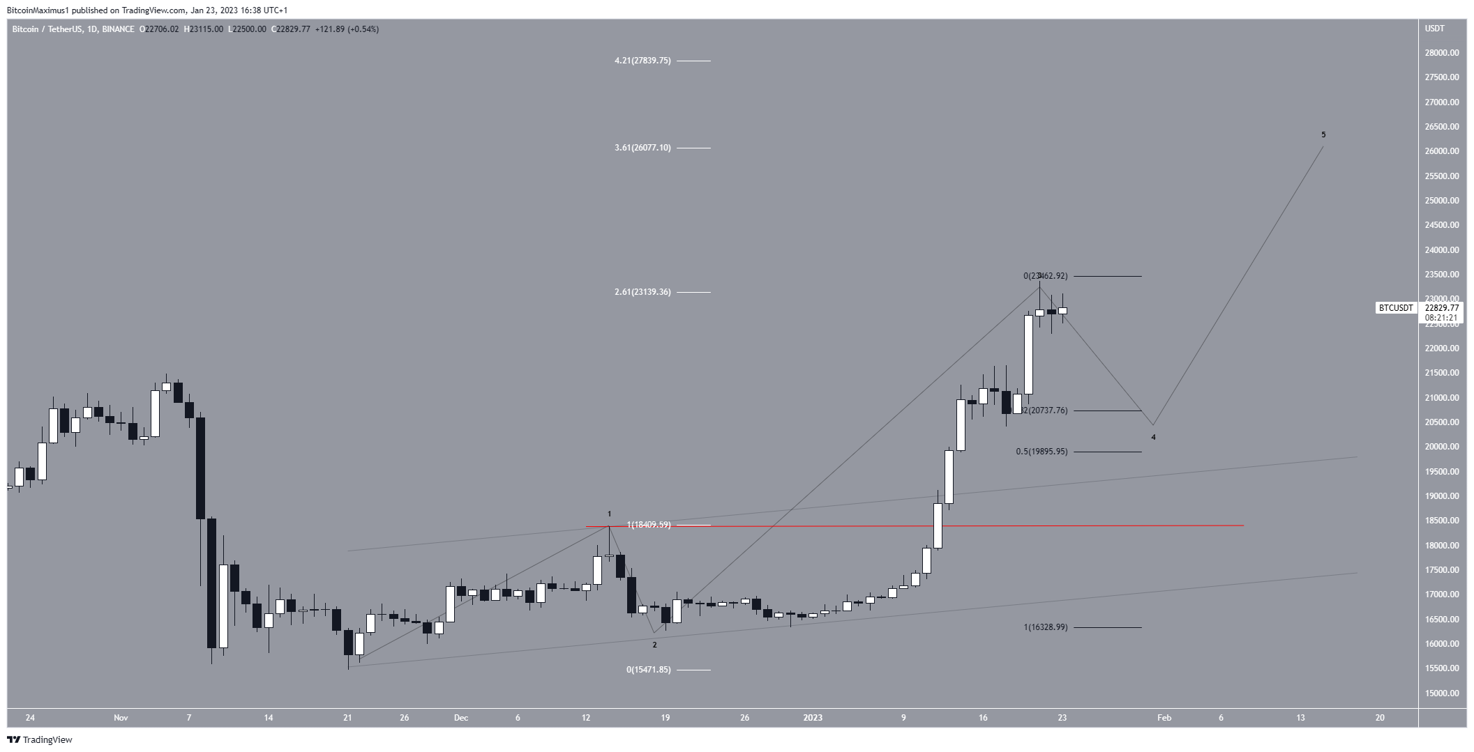Si el recuento es correcto, el BTC disminuirá hacia el nivel de soporte de retroceso de Fibonacci de 0.382 en 20,740 dólares o el de 0.5 en 19,900 dólares antes de moverse hacia arriba.