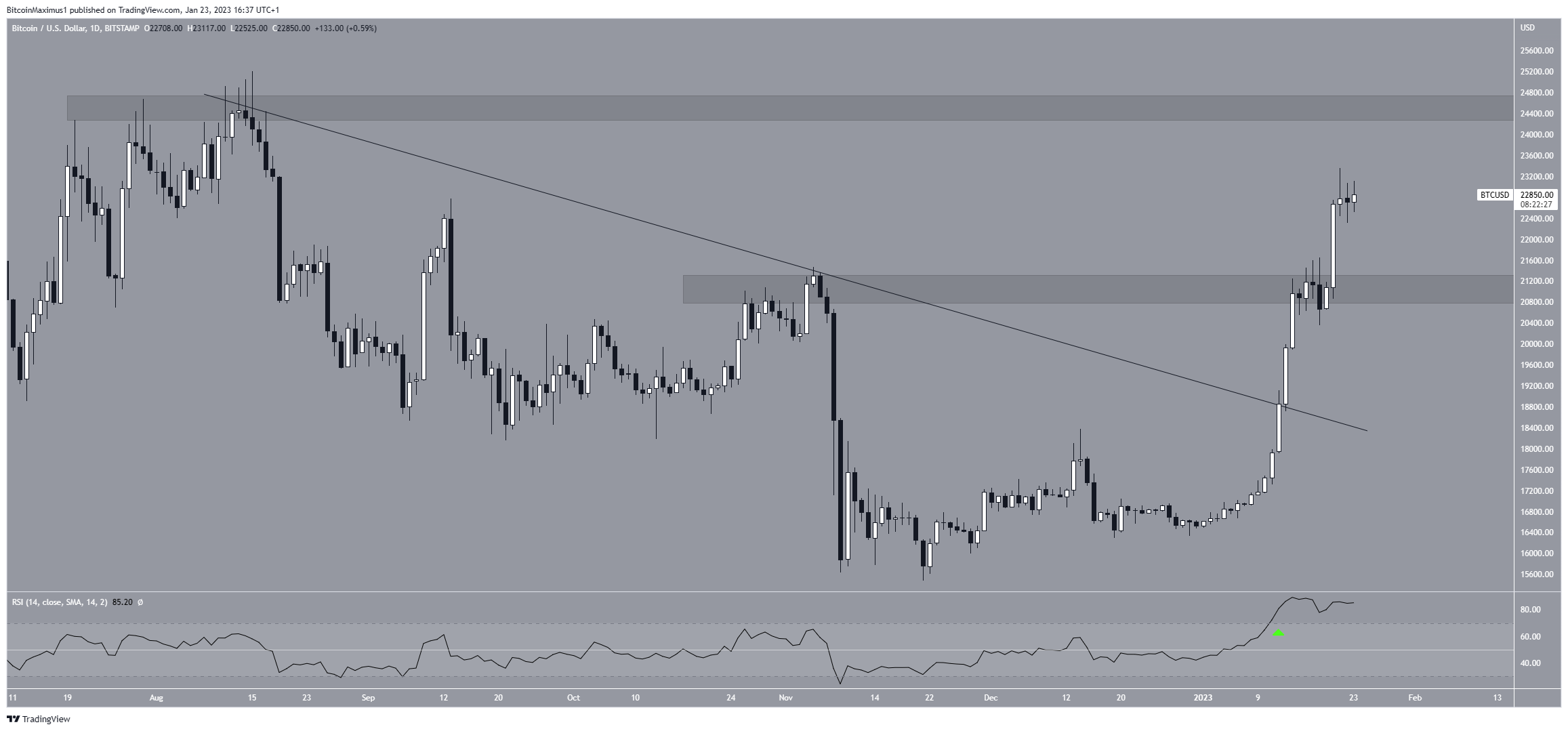 Posteriormente, el precio de BTC se movió por encima del área de 21,000 dólares y lo validó como soporte. Si el aumento continúa, la siguiente área de resistencia más cercana estaría en 24,500 dólares. Una ruptura por encima podría llevar el precio de Bitcoin a 30,000 dólares.
