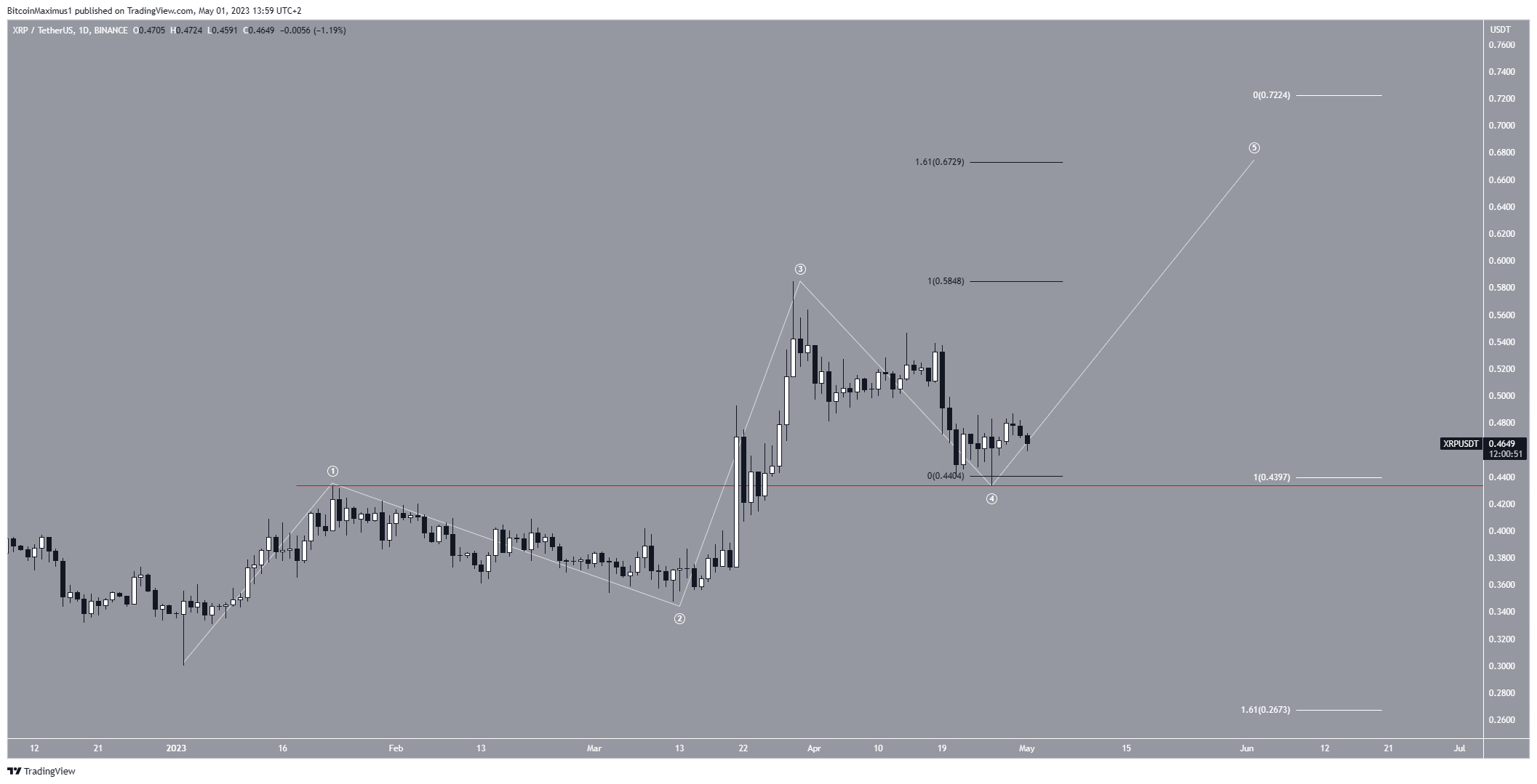 Sin embargo, una caída por debajo del máximo de la onda uno (línea roja) a 0.430 dólares invalidará este pronóstico alcista del precio de XRP.
