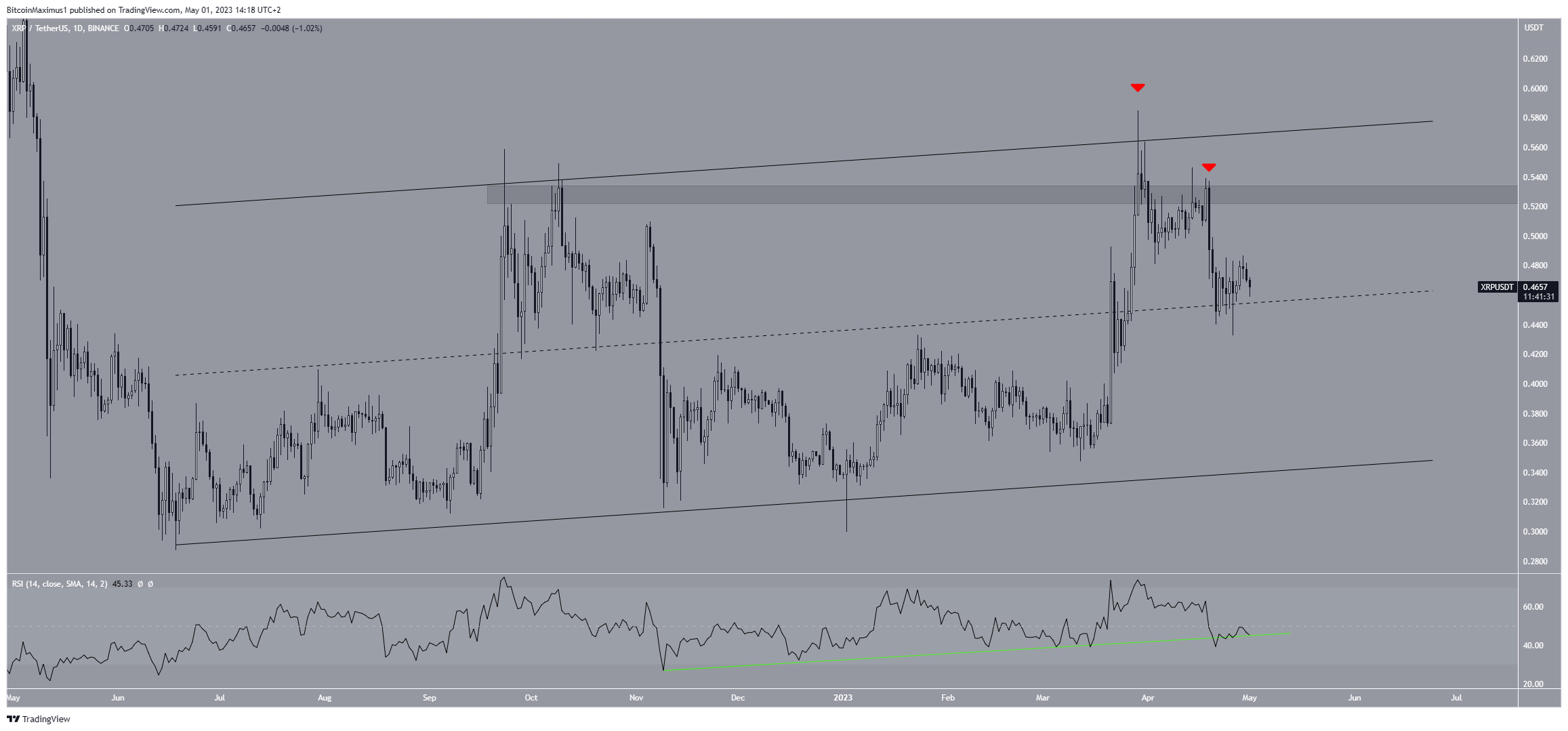 El precio de XRP se ha negociado dentro de un canal paralelo ascendente a largo plazo desde junio de 2022. Un canal paralelo ascendente es un patrón que implica que el precio rebota entre dos líneas paralelas de resistencia y soporte.