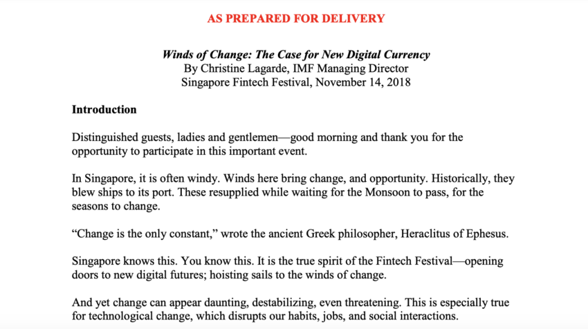 “Creo que deberíamos considerar la posibilidad de emitir moneda digital”, dijo Lagarde en una conferencia en Singapur en 2018.