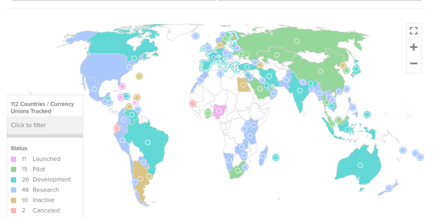 En mayo de 2020, solo 35 países consideraban una moneda digital de banco central, dijo. Al menos 50 países se encuentran en una fase avanzada de exploración, lo que significa desarrollo, piloto o lanzamiento. Alrededor de una docena de estados y países ya han lanzado completamente una moneda digital.
