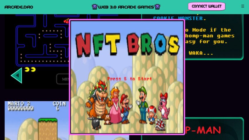 Arcade.DAO afirma ser una sala de juegos virtual para sus monederos Ethereum. El proyecto parece ofrecer varios juegos de arcade almacenados en IPFS y descritos como “no censurables”.