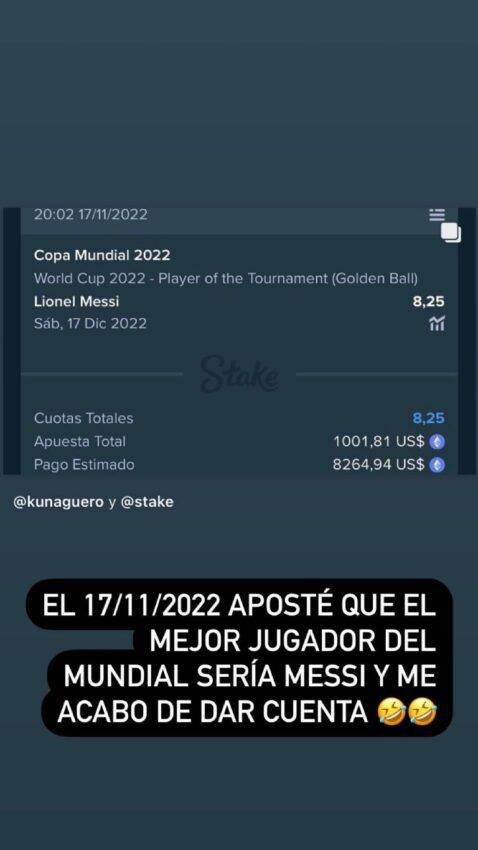 Sergio Kun Agüero subió una historia de Instagram en la que contó a sus 27 millones de seguidores en que hace más de un mes apostó en la plataforma Stake 1,000 dólares en ETH. Lo hizo asegurando que Lionel Messi sería galardonado como el mejor jugador del mundial. Y reveló, entre risas, que tal decisión le hizo ganar 7.200 dólares en la criptomoneda.