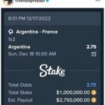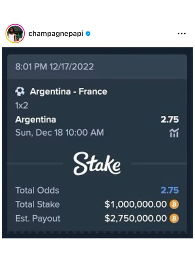 La apuesta hecha por el rapero canadiense tenía un coeficiente de 2,75 y en caso de que el combinado sudamericano hubiese ganado la final en el tiempo reglamentario, el músico habría ganado 2,750,000 de dólares. Eso no ocurrió porque Francia, a falta de 9 minutos, igualó las acciones. La apuesta, como ocurrió en otras ocasiones, el artista la realizó empleando Bitcoin.