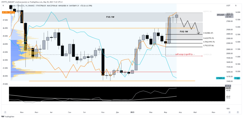 - En el gráfico semanal de BTC, puede ver que los valores de los precios han alcanzado el área de desequilibrio semanal bajista FVG 1W (26,895 dólares – 29,282 dólares), que fue la brecha de precios en el CME. En el rango de negociación actual, el precio se está reequilibrando con una clara manipulación de los máximos, lo que indica una corrección del crecimiento actual. Del análisis del volumen horizontal, se puede ver que los valores de precio están por encima de la zona de volumen.