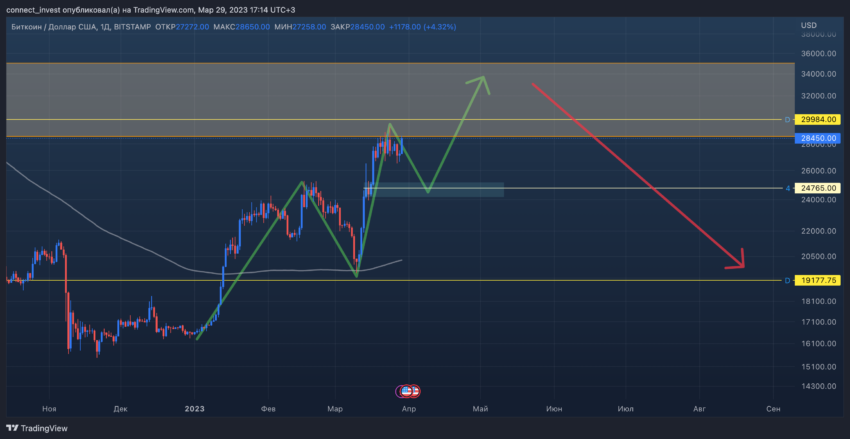El cofundador del fondo de inversión CONNECT INVEST, Maxim Poptsov, al igual que muchos de sus colegas, ve el potencial de la corrección de BTC. Al mismo tiempo, su pronóstico de Bitcoin para abril de 2023 implica que una caída temporal solo será una preparación para actualizar los máximos locales.