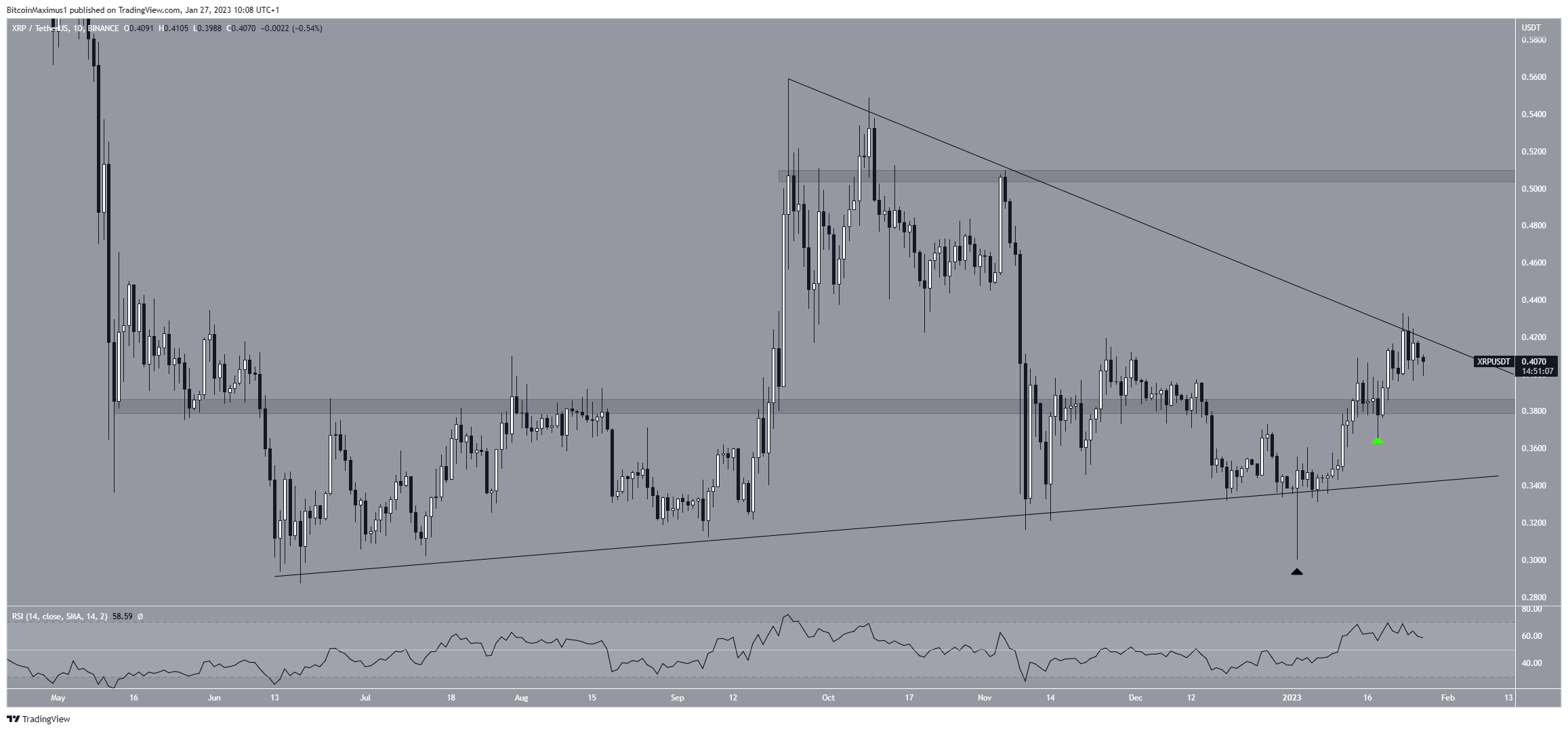 En primer lugar, el precio de XRP creó una enorme vela martillo alcista el 2 de enero (icono negro). La vela salvó una ruptura del triángulo y comenzó el movimiento ascendente en curso. A continuación, el precio de XRP recuperó el área horizontal de 0.385 dólares y la validó como soporte (icono verde). Ha intentado salir del triángulo en las últimas 24 horas.